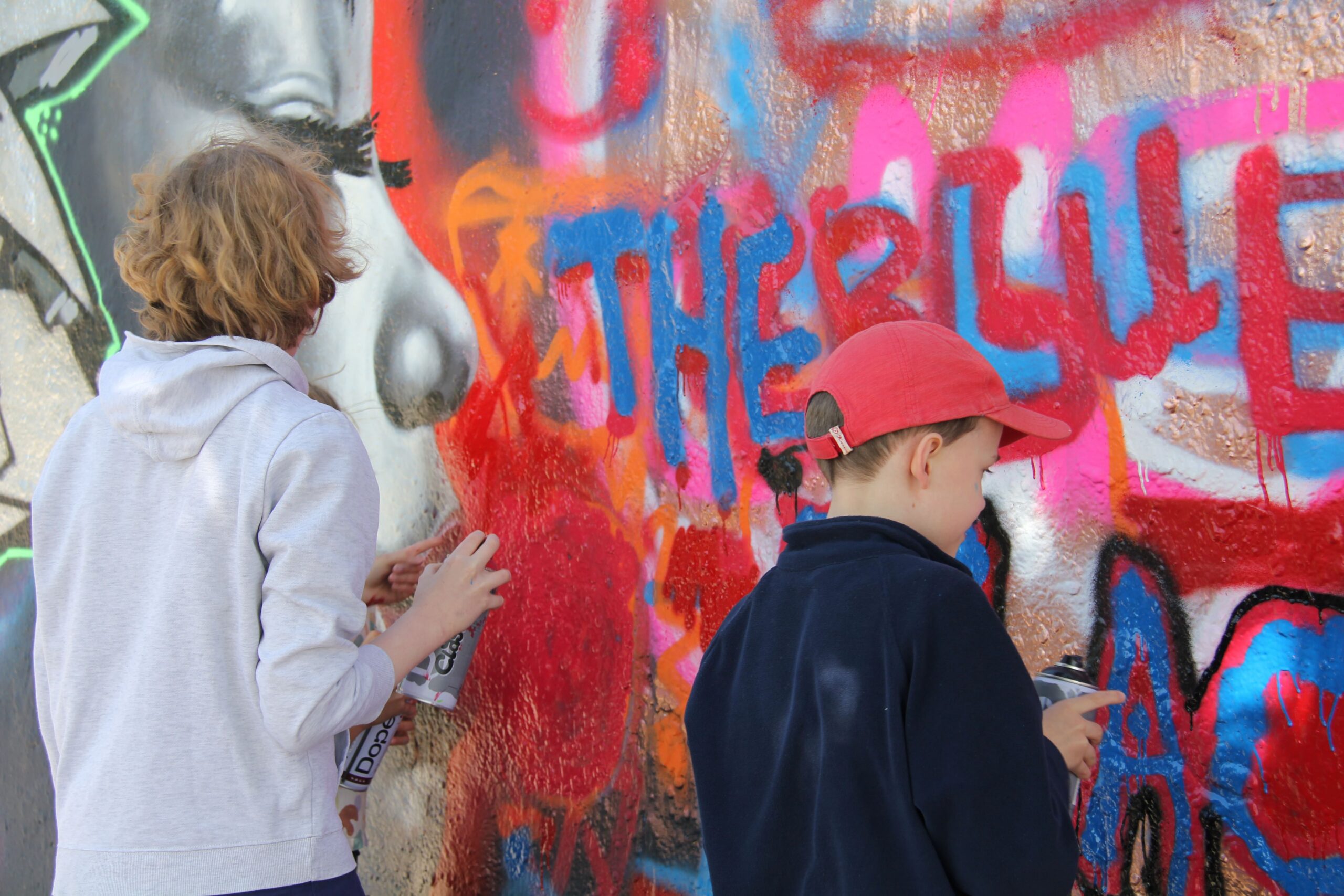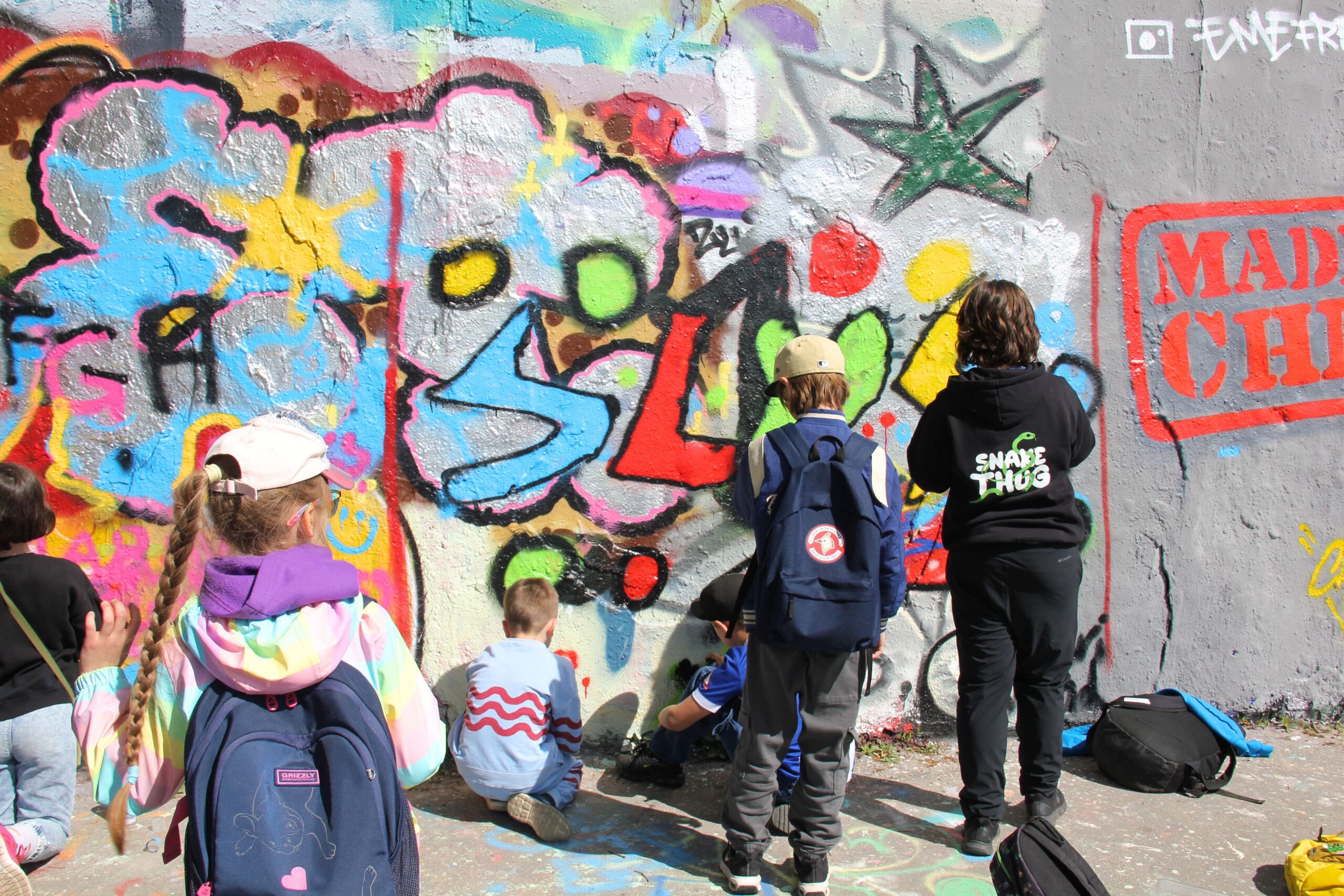 TAG 4 >>> STADT & AUSFLUG Wir diskutieren, ob Graffiti Vandalismus oder Kunst sein kann. Wir entwerfen Skizzen für Murals für kleine architektonische Formen und setzen sie im städtischen Raum um. Der letzte Tag ist ein großer Ausflug zum Mauerpark. Wir schließen uns zu einem Street-Art-Team zusammen und gestalten ein gemeinsames Mural.